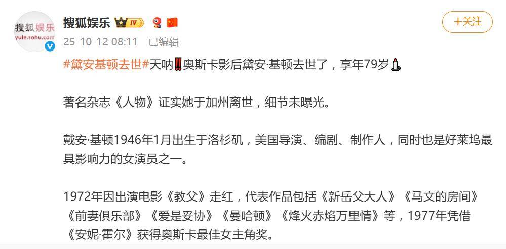 10月12日,好莱坞传来一则令人心碎的消息:奥斯卡影后黛安·基顿在加州去世,享年79岁。权威媒体《人物》杂志及多家影视媒体相继证实了这一消息,但具体细节尚未公开,仅透露
