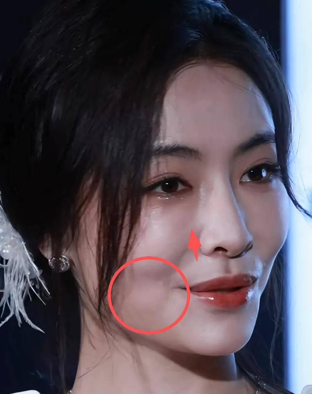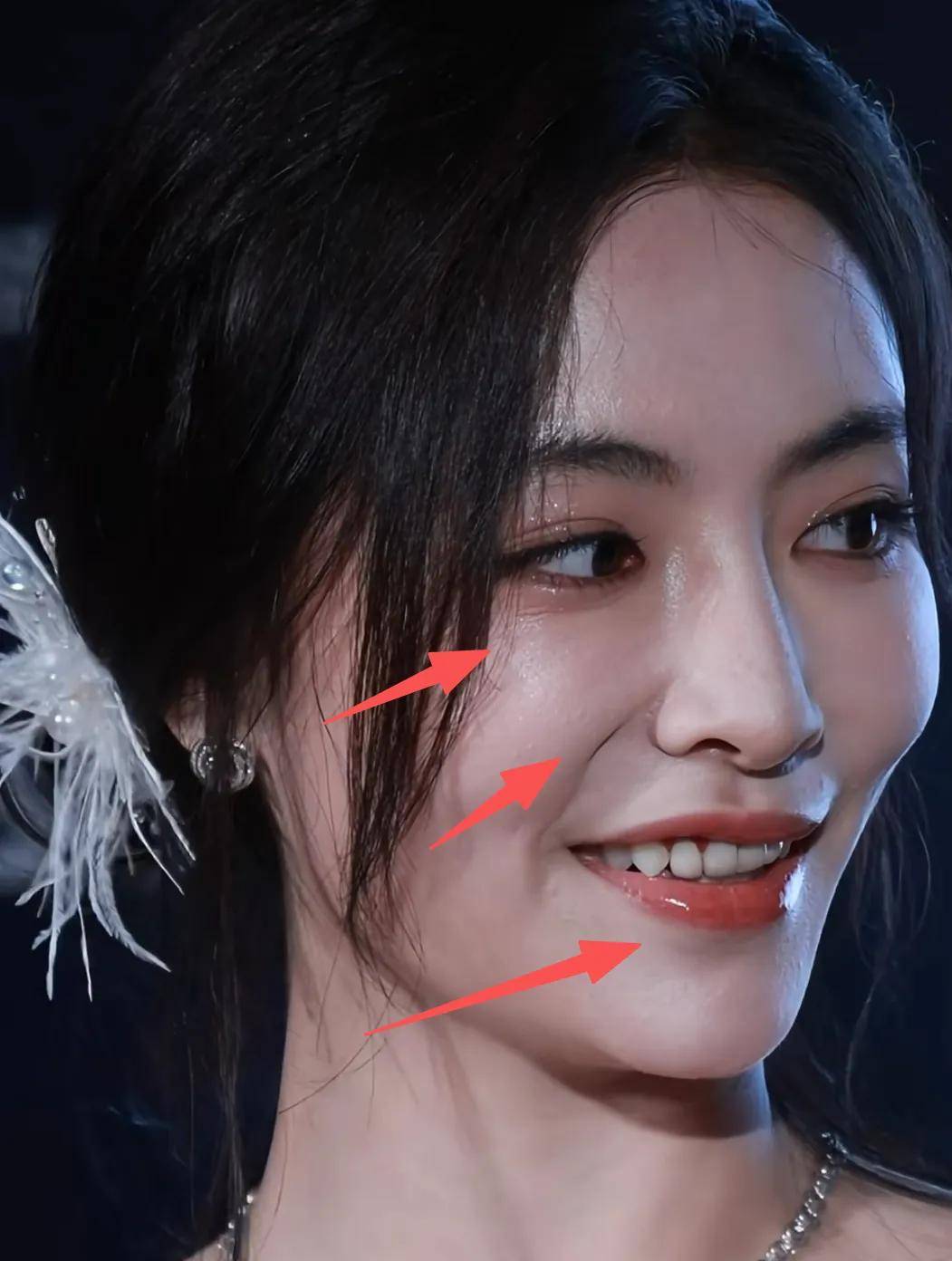 其三是面部的肿胀感和僵硬感,发达的苹果肌连带的嘴角肌肉线条不流畅,导致面部凹陷感严重。其四则是浮肿的眼袋和泪沟,非常显年龄。其实,仔细看这些怼脸图并不是纯生图,左右两边脸差异很大,一边皮肤细腻没有皱纹,一边则痕迹重,不知是修图缘故还是打光的区别。