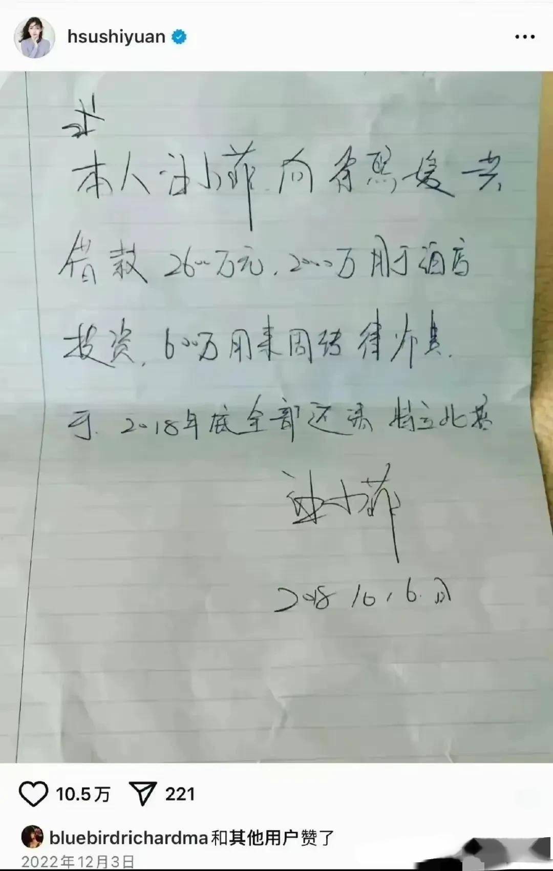 其实黄春梅早就晒出欠条了,只不过这张欠条的官司打了很多次了,大概率是汪小菲已经赔付过了。