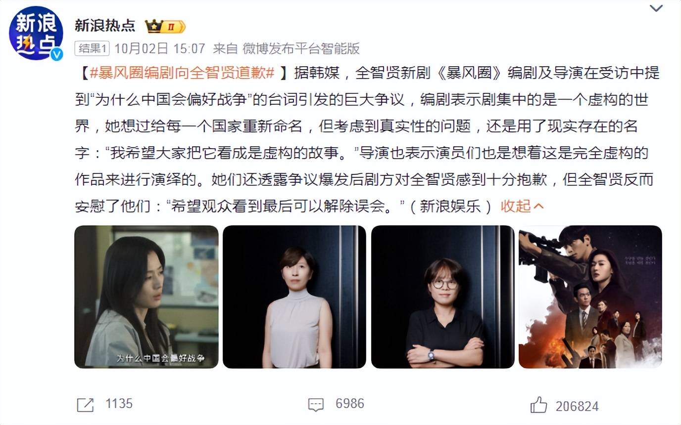 全智贤在《暴风圈》电视剧中饰演一名政客,替夫走上竞选总统之路,是一部大女主爽剧。投资成本700亿韩元的电视剧,本该口碑大丰收,却因剧中的台词,走向了大舆论风波。
