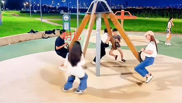 一家人骑山地车到湖边的公园散心,马筱梅带着孩子们玩飞椅,一家四口一人一把椅子,小杨阿姨则是帮一家人旋转,俩孩子被吓得尖叫连连,但都笑的很开心。