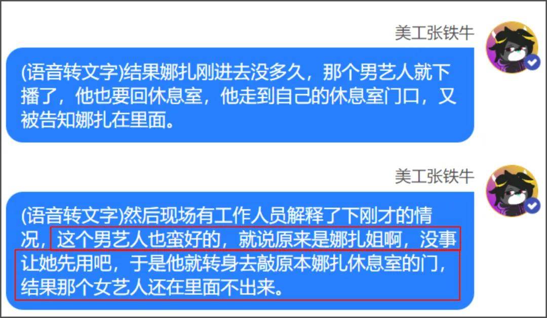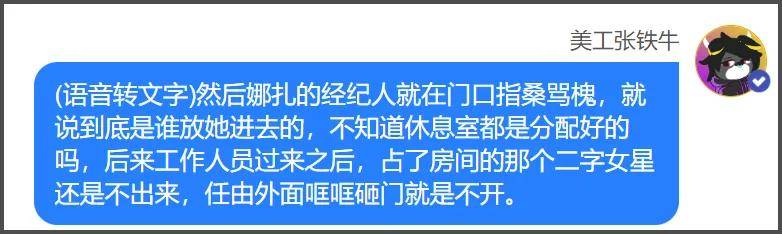 但这位男星工作完回来也需要休息,得知事情来龙去脉之后,男星大方把休息室借给了娜扎,转头去敲那位抢别人休息室的二字女星的门。但对方主打一个谁来都没用,就是强占不走,最终隔壁品牌方的工作人员让出了自己的休息室给男星,这事儿才算完,最后受累的还是打工人。
