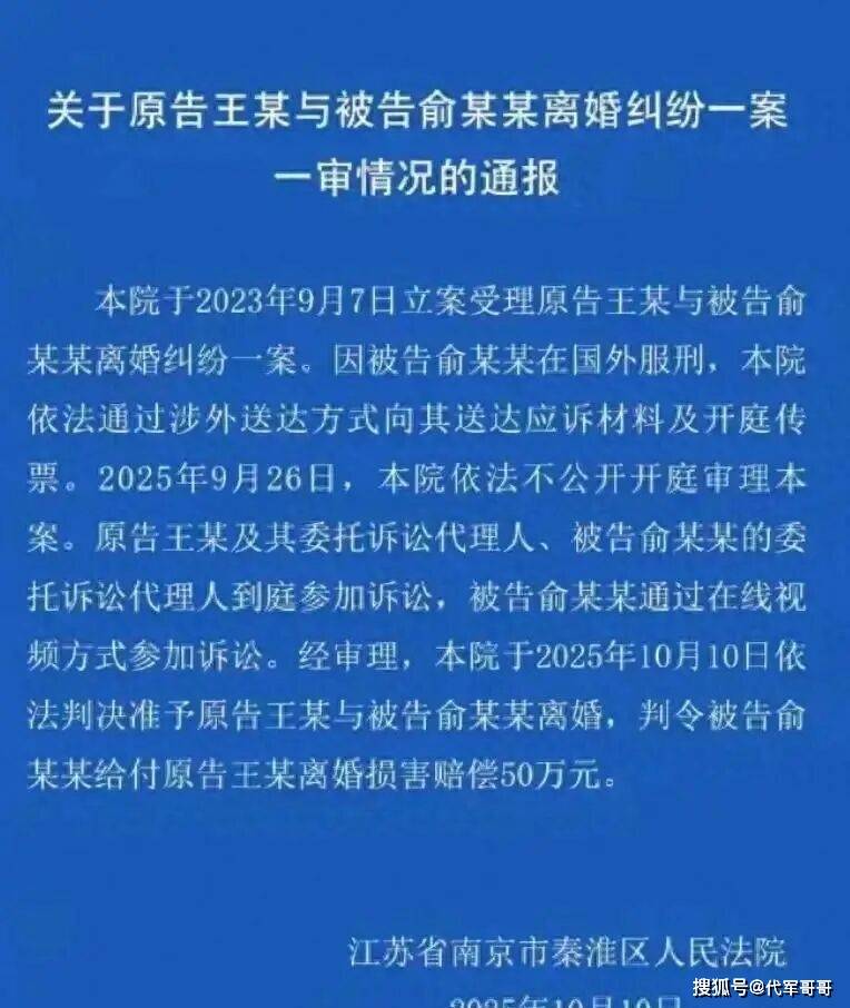 2025 年 10 月 10 日,南京秦淮区法院的一审判决为这场历时 2302 天的跨国诉讼画上关键句点 —— 准予离婚并判令俞晓冬赔偿 50 万元。这一结果暗藏多重司法突破。