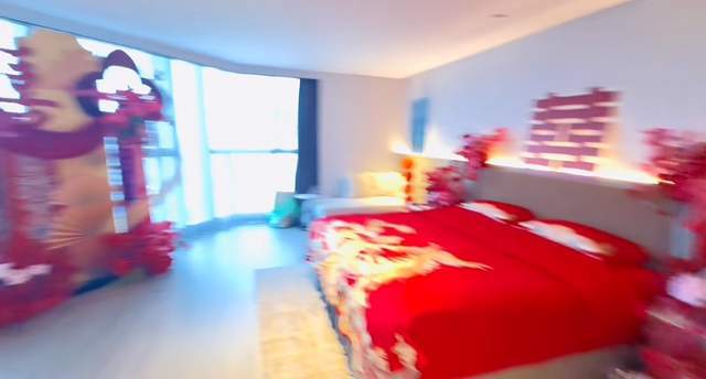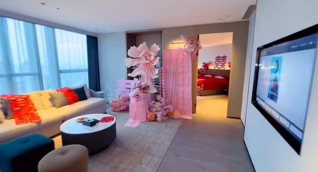 见的房间中有一张铺满喜被的双人床,周边则摆满了鲜花以及贴着巨大的喜字,靠窗的位置还有各种吸引人眼球的装扮等等,整体来说,简洁但却不失喜气。