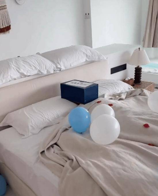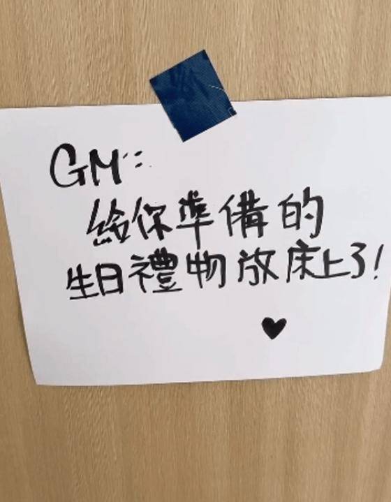 叶蒨文在社交网分享了一段视频,视频中房间门外贴着一张纸条,上面写着 “GM:给你准备的生日礼物放在床上了!” 画面中,GM 的手推开了一扇门,房间大床上放着一个礼物盒,盒子上写着 “你最喜欢的!”。