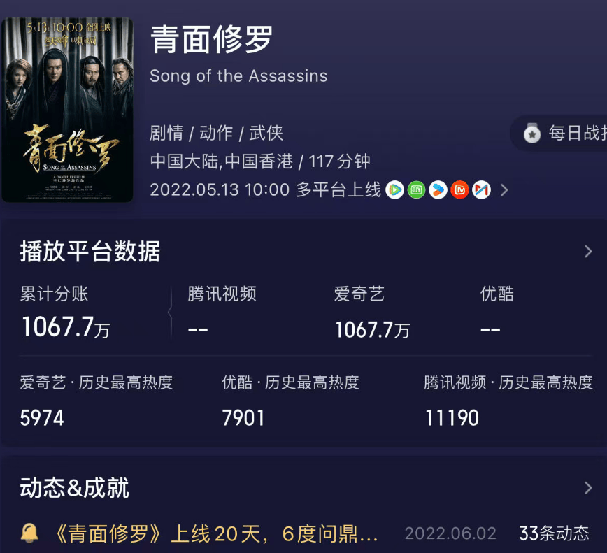 2022年5月13日,投资2.2亿的《刺局》突然改名成了《青面修罗》,并在爱奇艺、腾讯视频、优酷、芒果TV等平台热播!