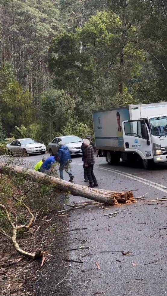 据梁芷珮讲,为了挪开这棵大树,他们等了十几分钟才凑够男人,最后大家一起合力将大树搬走。