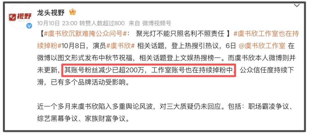 据悉,在虞书欣风波东窗事发后,媒体持续喊话虞书欣针对霸凌、黑幕、家族财富争议进行回应,但这段时间,只有工作室在中秋节当天更新了动态,虞书欣本人始终没有任何动向。在公众信任度持续下滑的情况下,虞书欣本人已经掉粉200多万,工作室也在持续掉粉中。