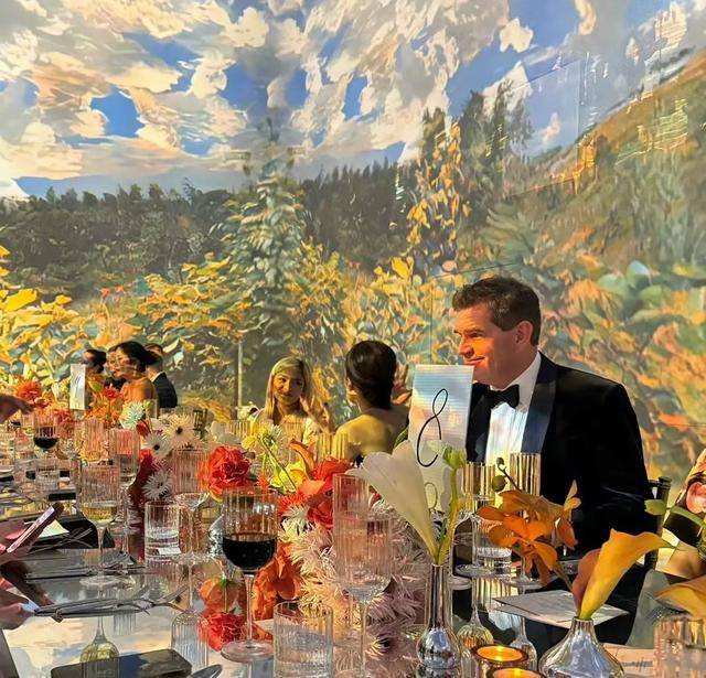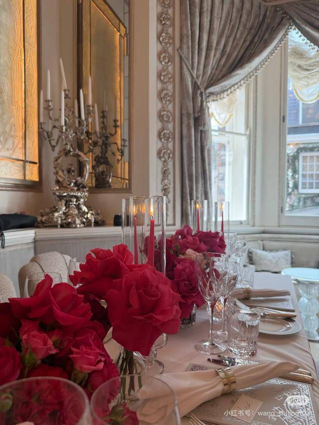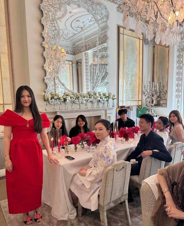 他们在一家英氏宫廷的高档餐厅里举办了派对,不止很王室范儿,白色的长餐桌,上面都是鲜花和高档餐具,里面的灯和镜子都是复古宫廷风,一看就很高级和高档,满满的英伦风。