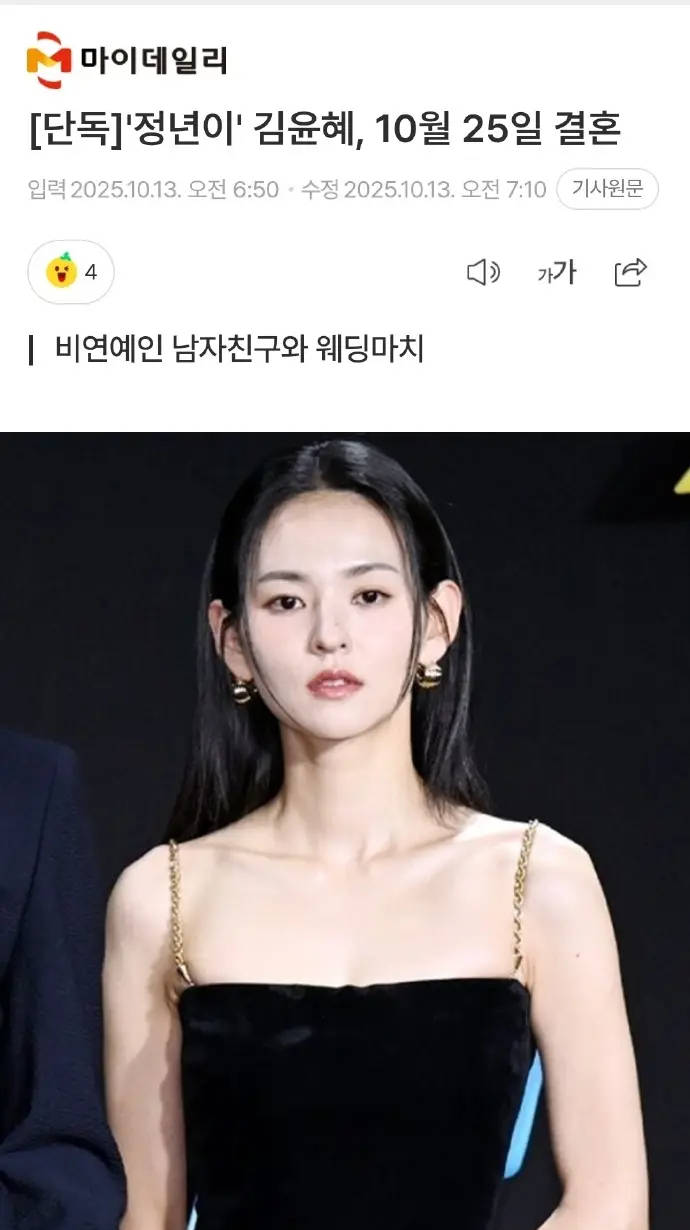 13日,韩国演员金允慧官宣将于本月25日结婚。据悉,婚礼形式为非公开的小型仪式,仅邀请家人及亲近好友出席,不会对外公开细节。