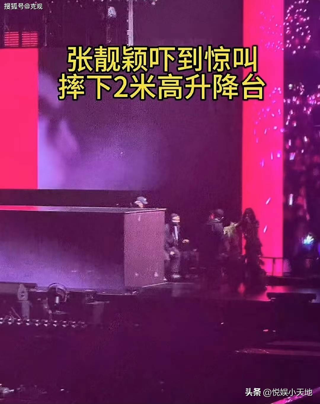 这个舞台据说有两米来高,张靓颖摔下去后她整个人是懵的,无法自己站起来。后台的工作人员第一时间就冲了上去,令人泪目的是张靓颖起来后第一时间就是先安慰被吓到的粉丝们。