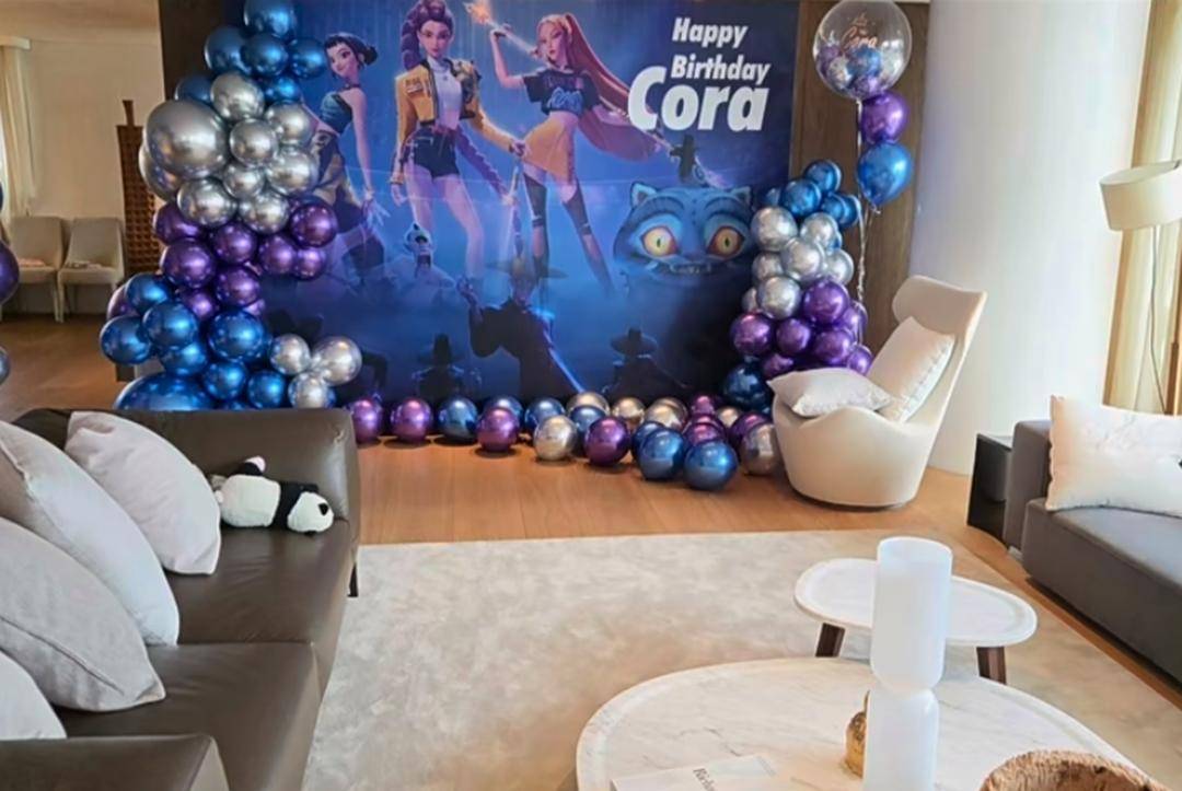 从视频画面来看,郭碧婷用心营造了浓厚的生日仪式感。宴会以Cora最喜爱的动漫为主题,背景板上是几位酷炫飒爽的动漫女孩,周围点缀着蓝紫色气球。从布置风格来看,Cora的个性更偏向奶奶向太那种气质,而非郭碧婷较为甜美的风格。