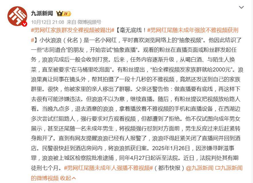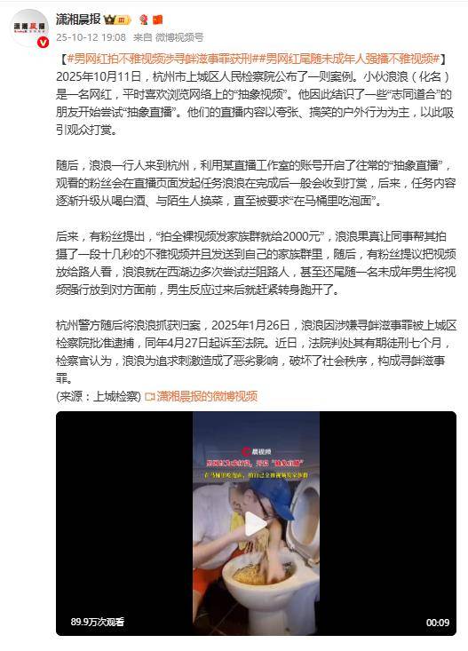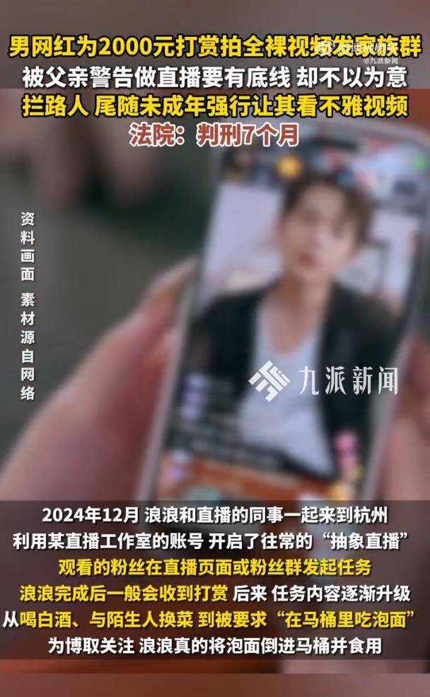 曾经在小众圈层里风靡的“抽象直播”,这次终于撞上了法律的铁板。据10月12日报道,网红“浪浪”为博打赏,从在马桶里吃泡面,到拍摄全裸视频发家族群,最后竟在西湖边尾随一名未成年男生,强行将不雅视频怼到对方眼前——这一系列毫无底线的操作,最终为他换来了一纸判决:有期徒刑七个月。