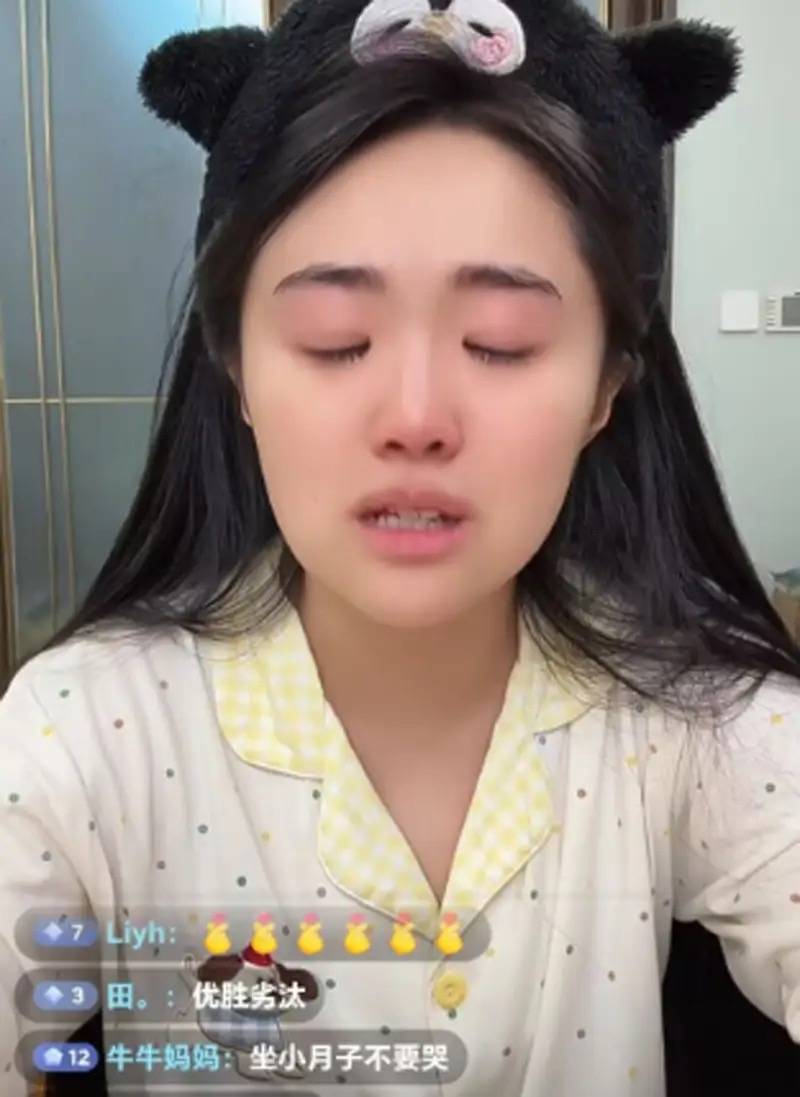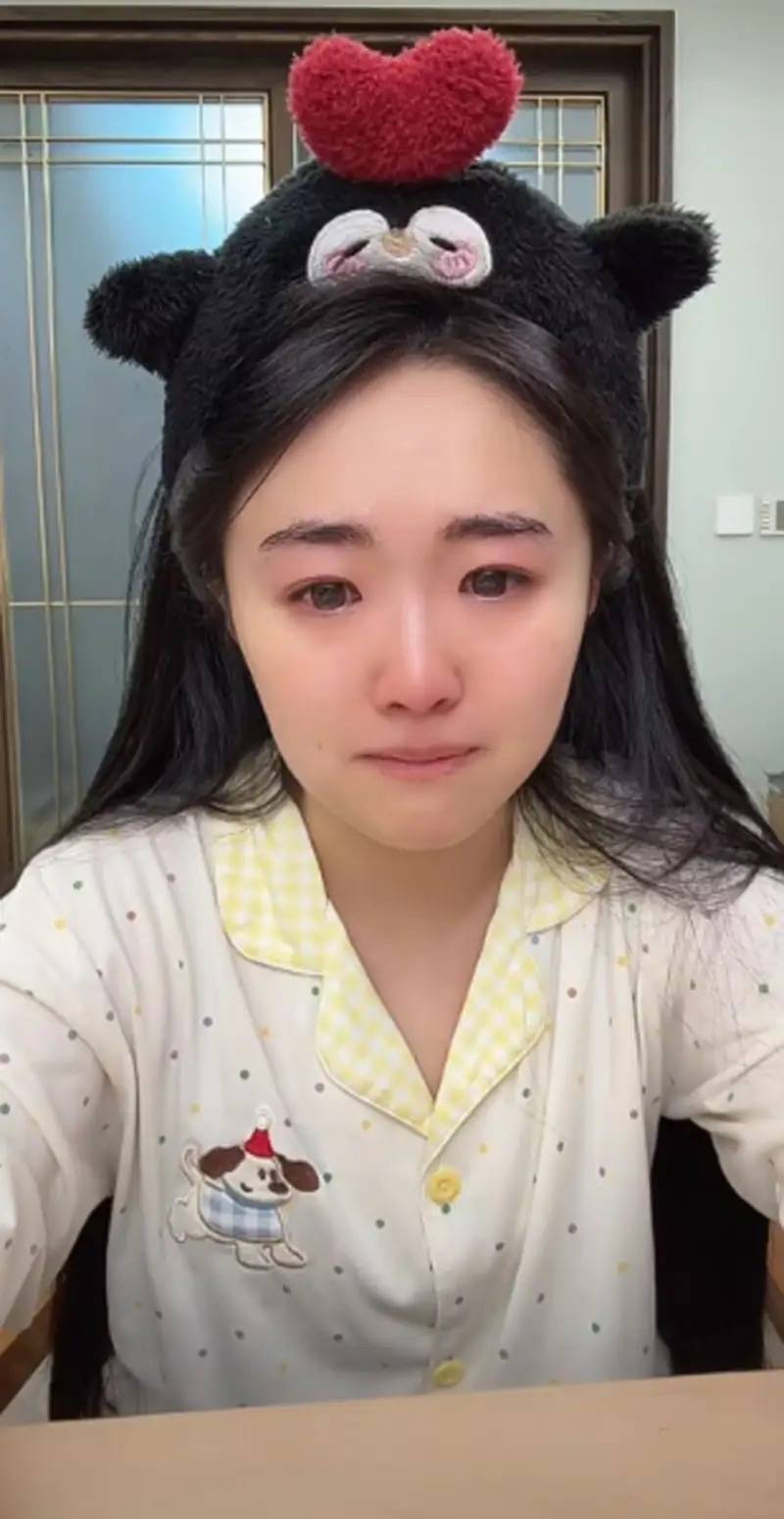 娃娃穿着睡衣,戴着发箍,坐在了屏幕前。她双眼通红、连鼻尖都红了,没有化妆、看着就像刚哭过一样,太让人心疼了。