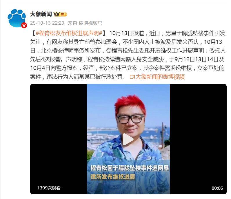 10月13日,北京韬安律师事务所一纸声明,将编剧程青松持续遭受网暴与人身安全威胁的维权进展公之于众——他已先后4次报警,其中一名施暴者潘某某已被行政处罚,引发全网关注。