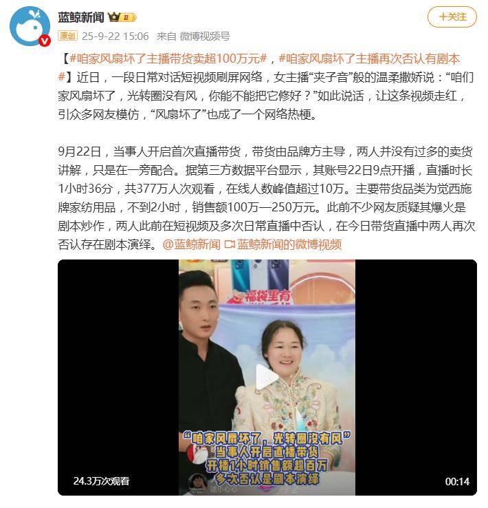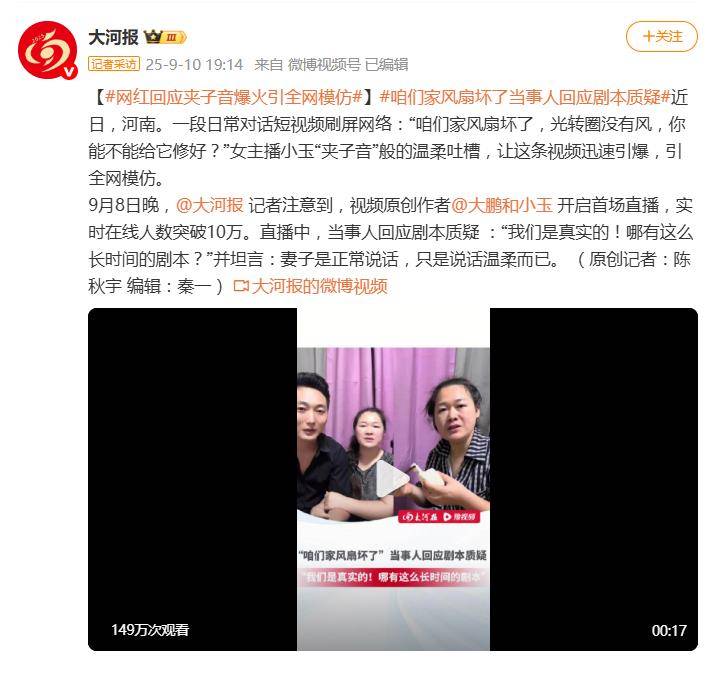 最近,一段关于博主大鹏和小玉的日常对话突然刷屏:“咱们家风扇坏了,光转圈没有风。”女主角小玉因声线极其细腻,被网友贴上“夹子音”标签,随即引发全网模