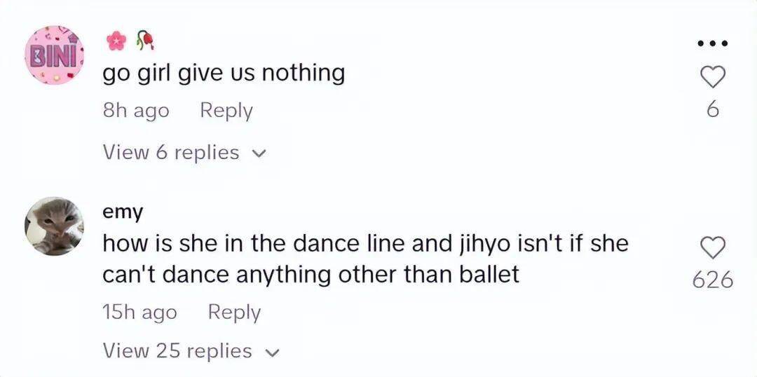 支持Mina的粉丝强调,她的舞蹈本就以芭蕾底子为特色,动作强调线条与柔美,与力量型舞风本就不同。但反对者则甩出直拍对比图,指出在同一套编舞下,Mina的幅度、力度甚至表情管理都明显“掉线”,直言“优雅不是划水的借口”。
