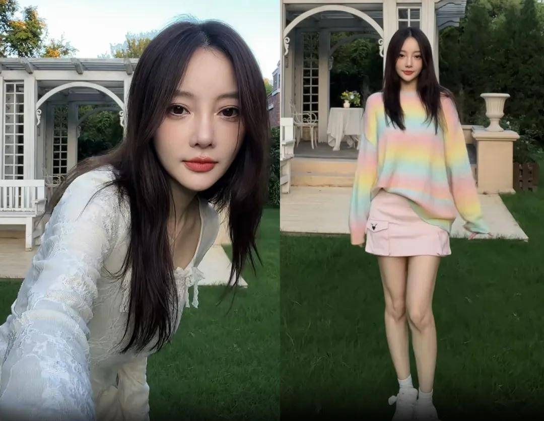 当镜头拉近,可以看到怼脸生图里她的脸是饱满的,细纹和皱纹也不多,但这状态跟日常照里的模样确实存在不少差距。回过头来看这身粉嫩的打扮,说没有违和感那肯定是假的。