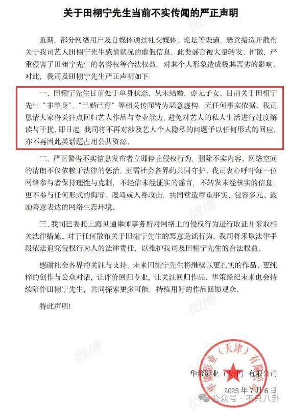 先是华策发布严正声明,明确田栩宁:“目前单身,从未结婚亦无子女”。