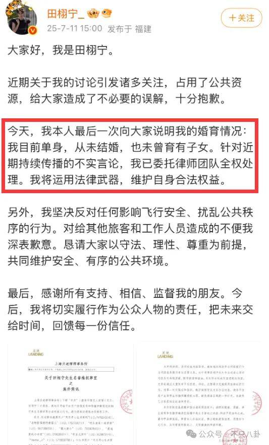 再是田栩宁本人义正言辞地回应:“我目前单身,从未结婚,也未曾育有子女。”