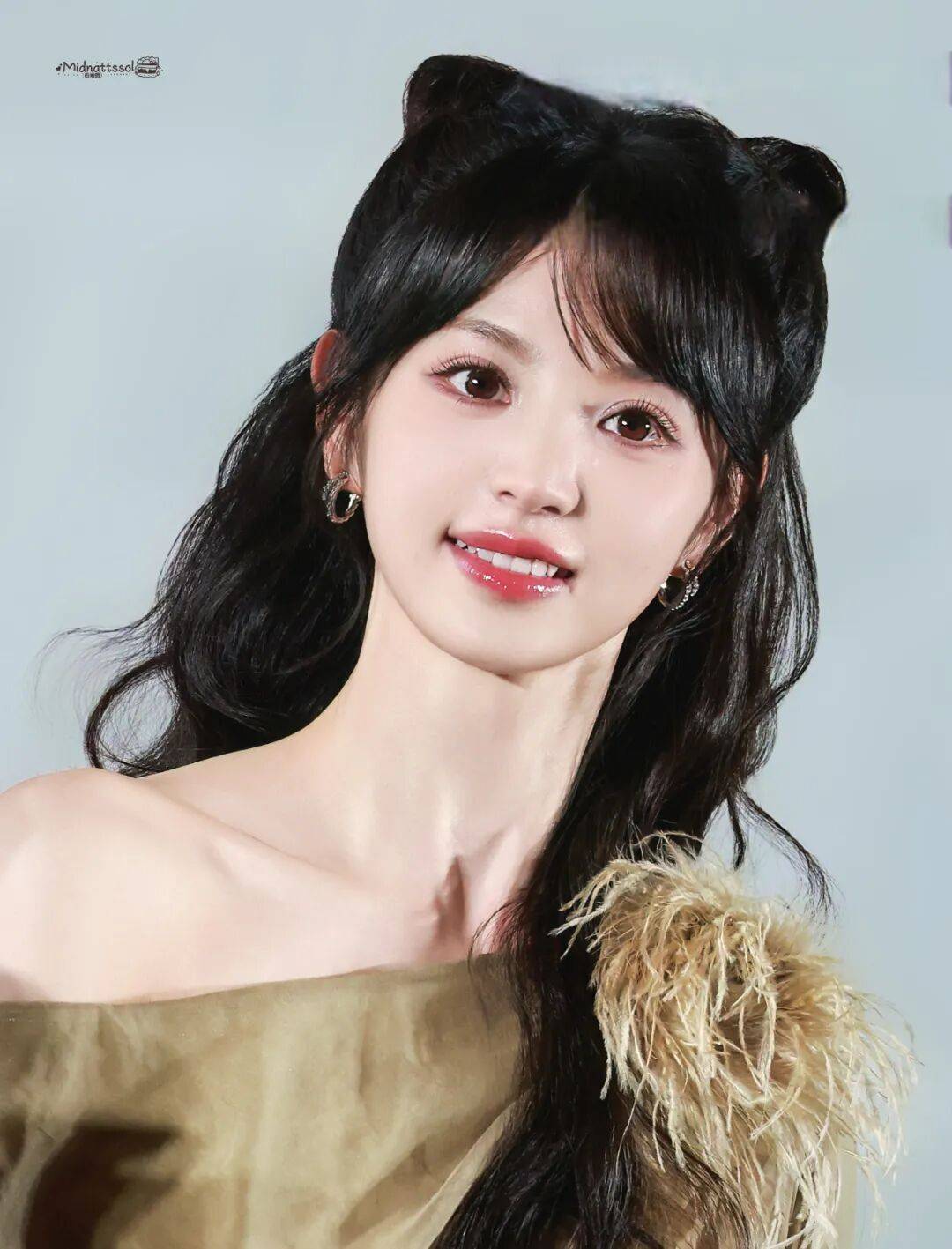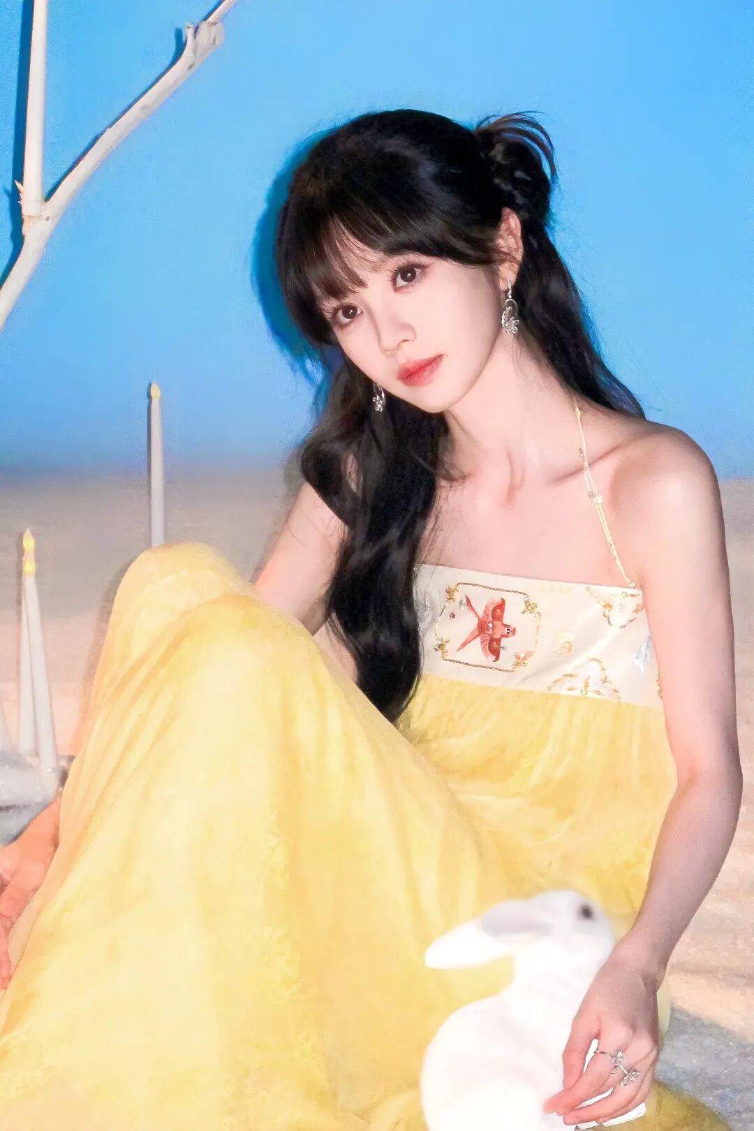 她写真采用光影渐变与立体花卉元素,水晶钉珠裙摆、玫瑰装饰呼应其橘粉色应援色,粉丝将紫裙造型与待播角色关联(《子夜归》猫妖武祯、《天才女友》学霸林知夏),强化角色期待。