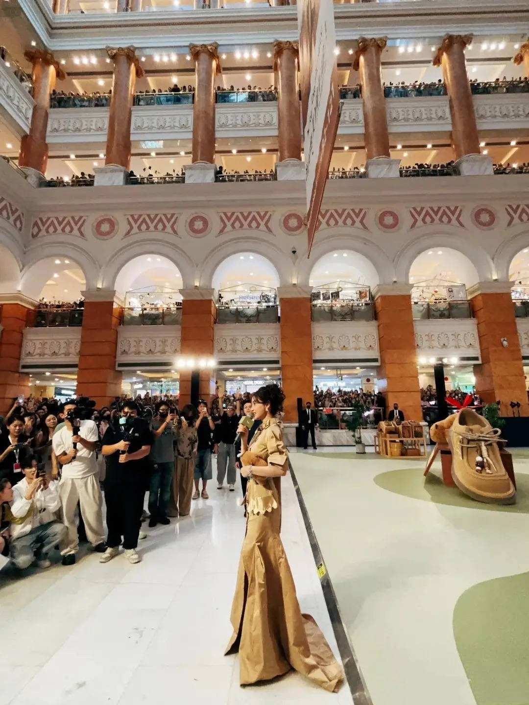 他穿着卡其色的长裙,扎了丸子头,有一种很慵懒很大方的美。感觉Baby瘦了很多、站在那里像竹竿一样,双腿特别细。