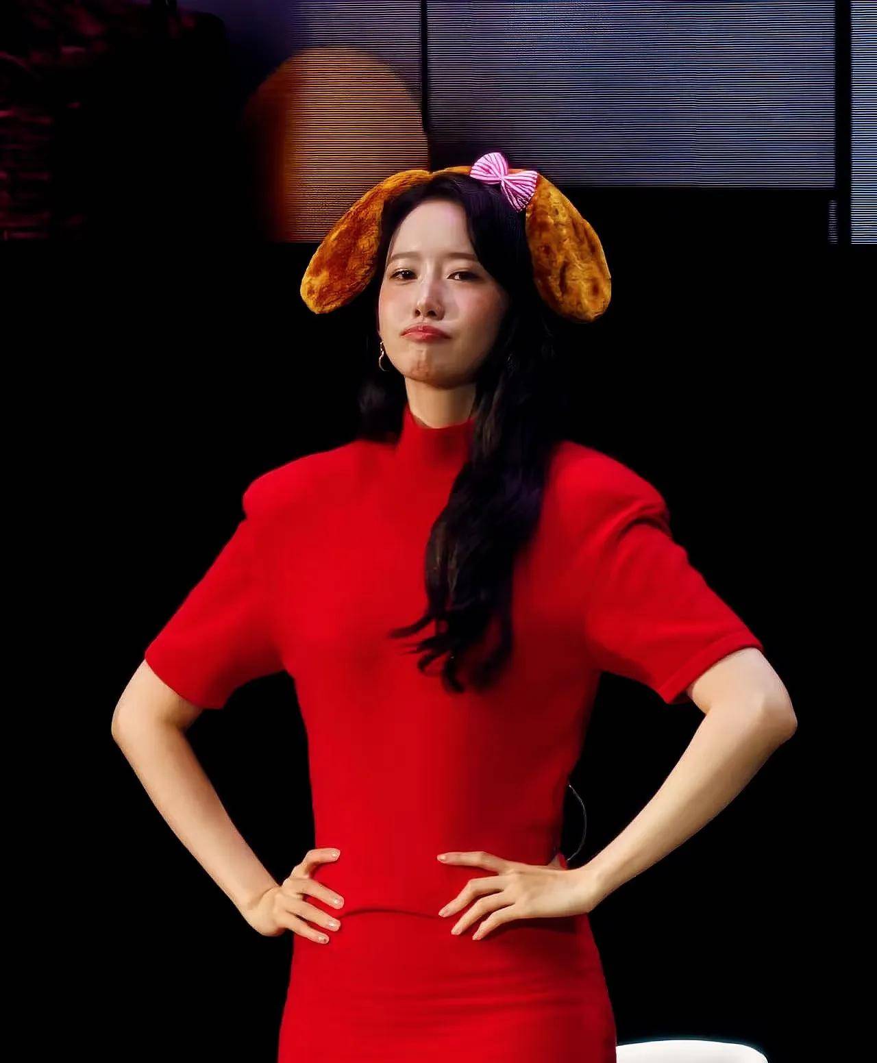 她一出场我眼睛都亮了!穿了条正红色的紧身针织短裙,刚到大腿根,腰细得好像一掐就断,脚上配了双同色高跟鞋,脚踝细得跟筷子似的。头发是浅棕色大卷,随便披在肩上,最绝的是头上那个浅粉色小熊发箍,耳朵上还带小亮片,一晃一晃的。她还总歪头、吐舌头,活脱脱一个女大学生,谁能想到她都三十多了啊!