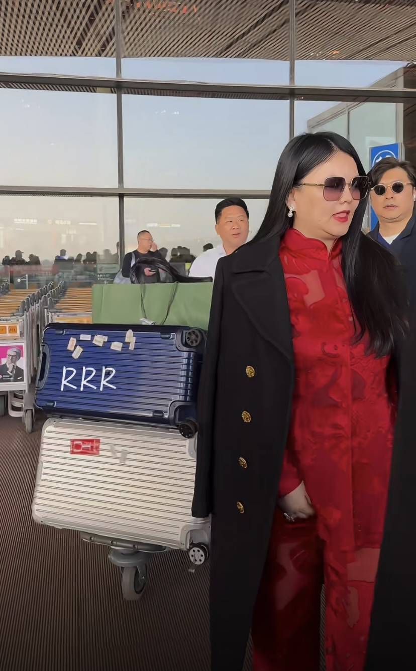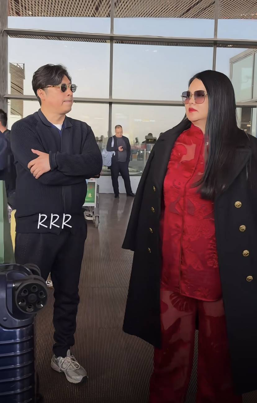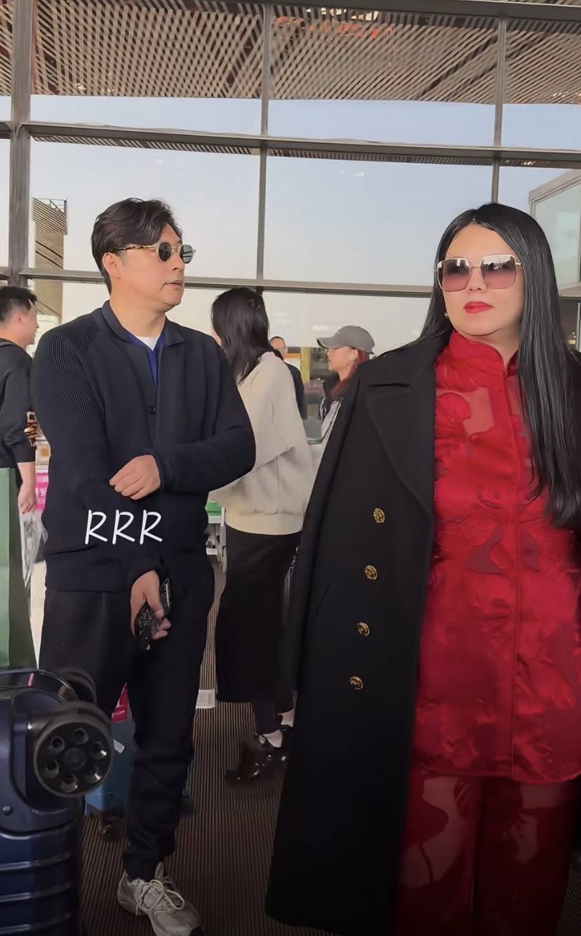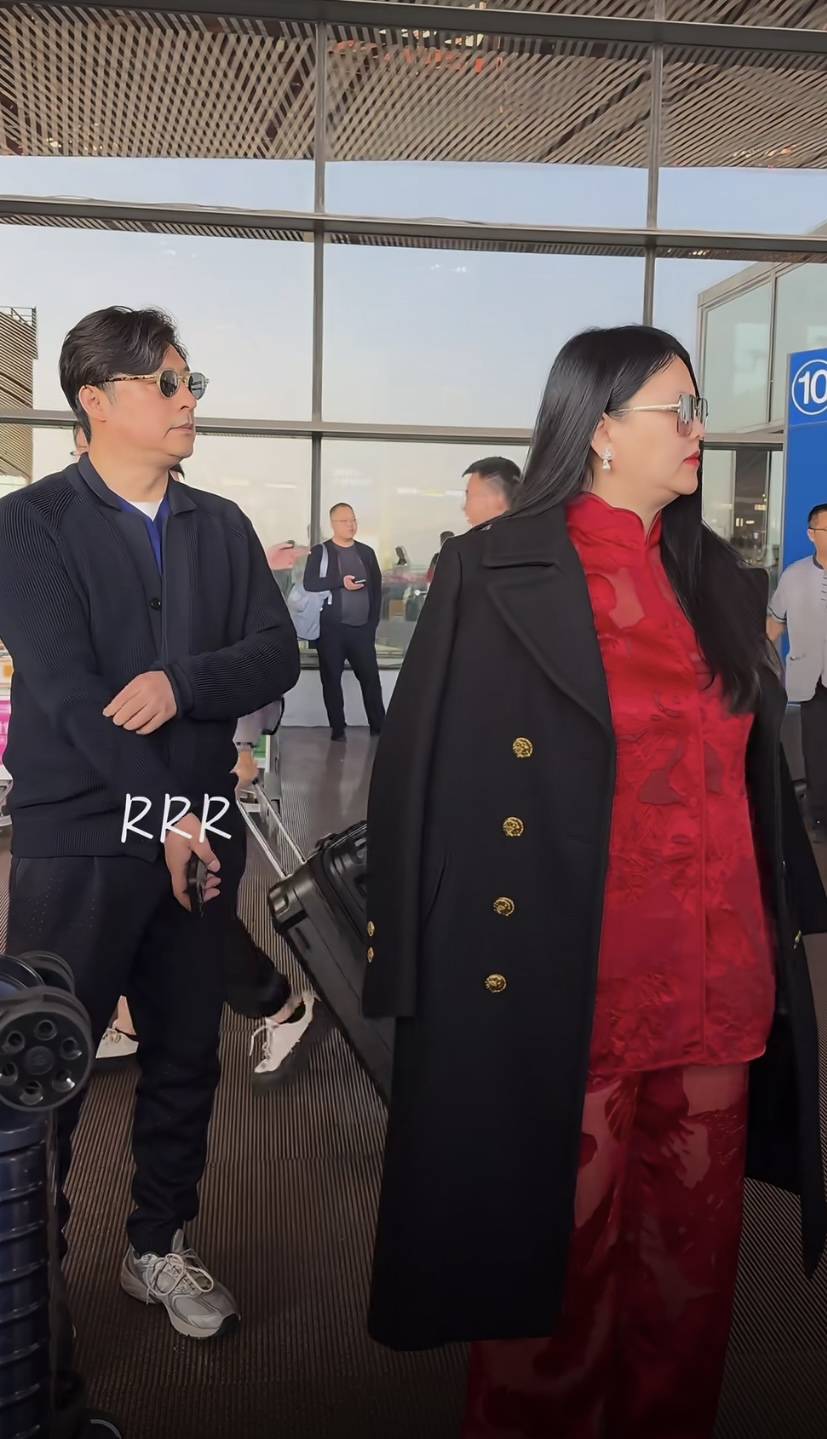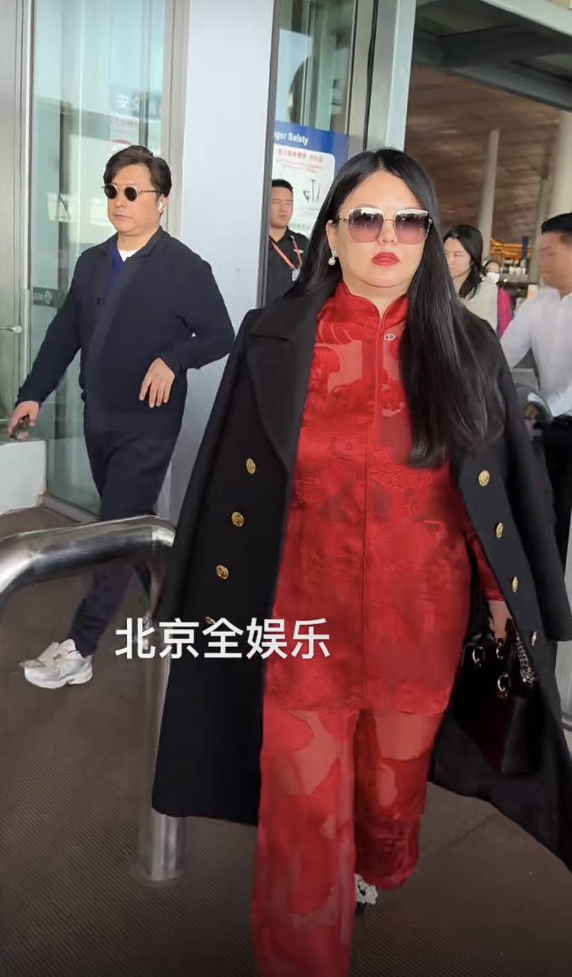 李湘穿起来显得浮夸,很大一部分原因还是她自身体重基数太大了。红色内搭、黑色大衣,红黑配色在视觉上本应该听高级的。