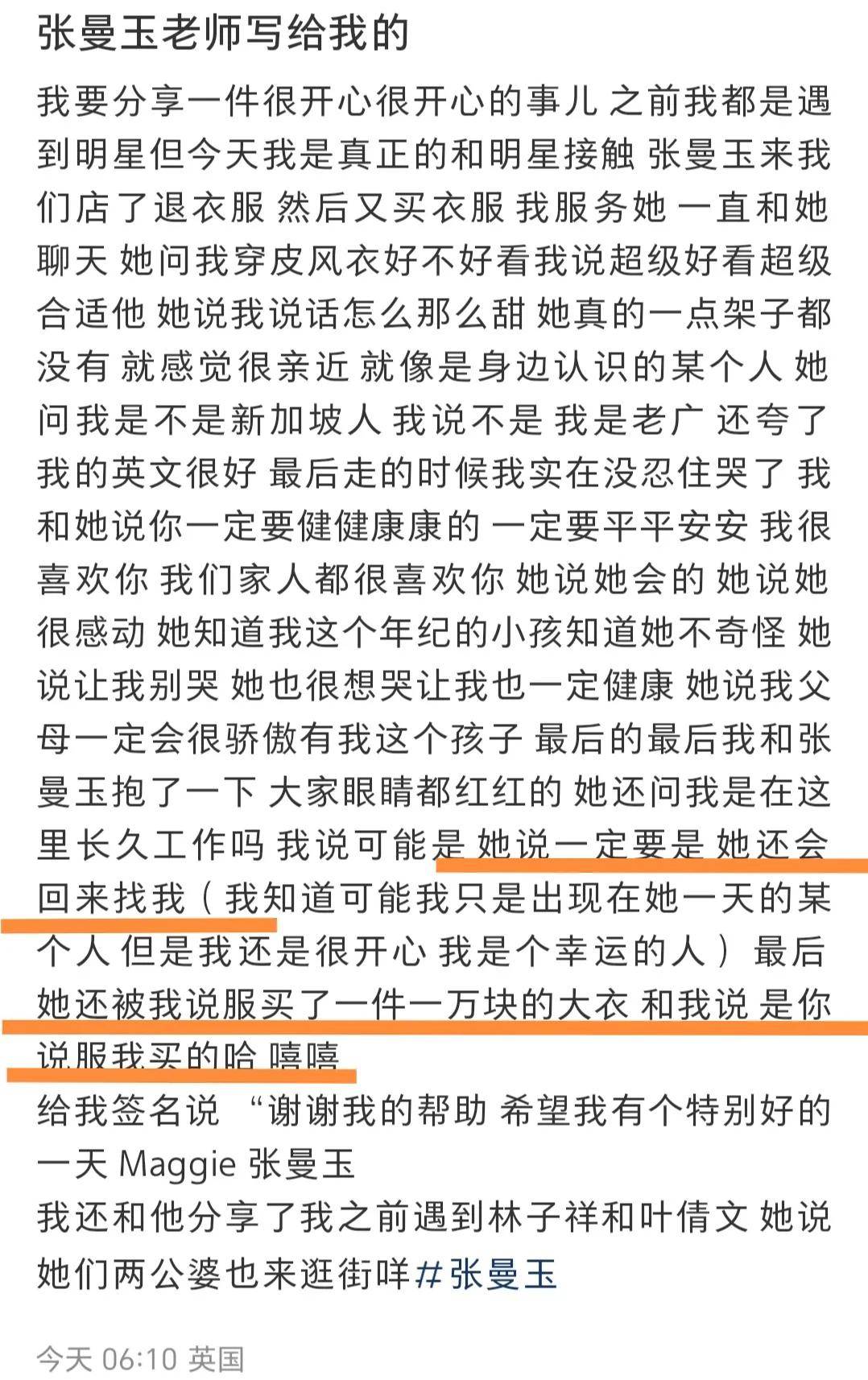 张曼玉临走前,博主忍不住哭了,说自己和家人都喜欢她,希望她一定要健健康康的,平平安安的。张曼玉也感动得想哭,然后安慰博主,并抱了抱她。最后,她说还会回来找博主的。搞笑的是,张曼玉在博主的劝说下买了一件上万块的大衣,应该是那件风大衣吧?哈哈哈。