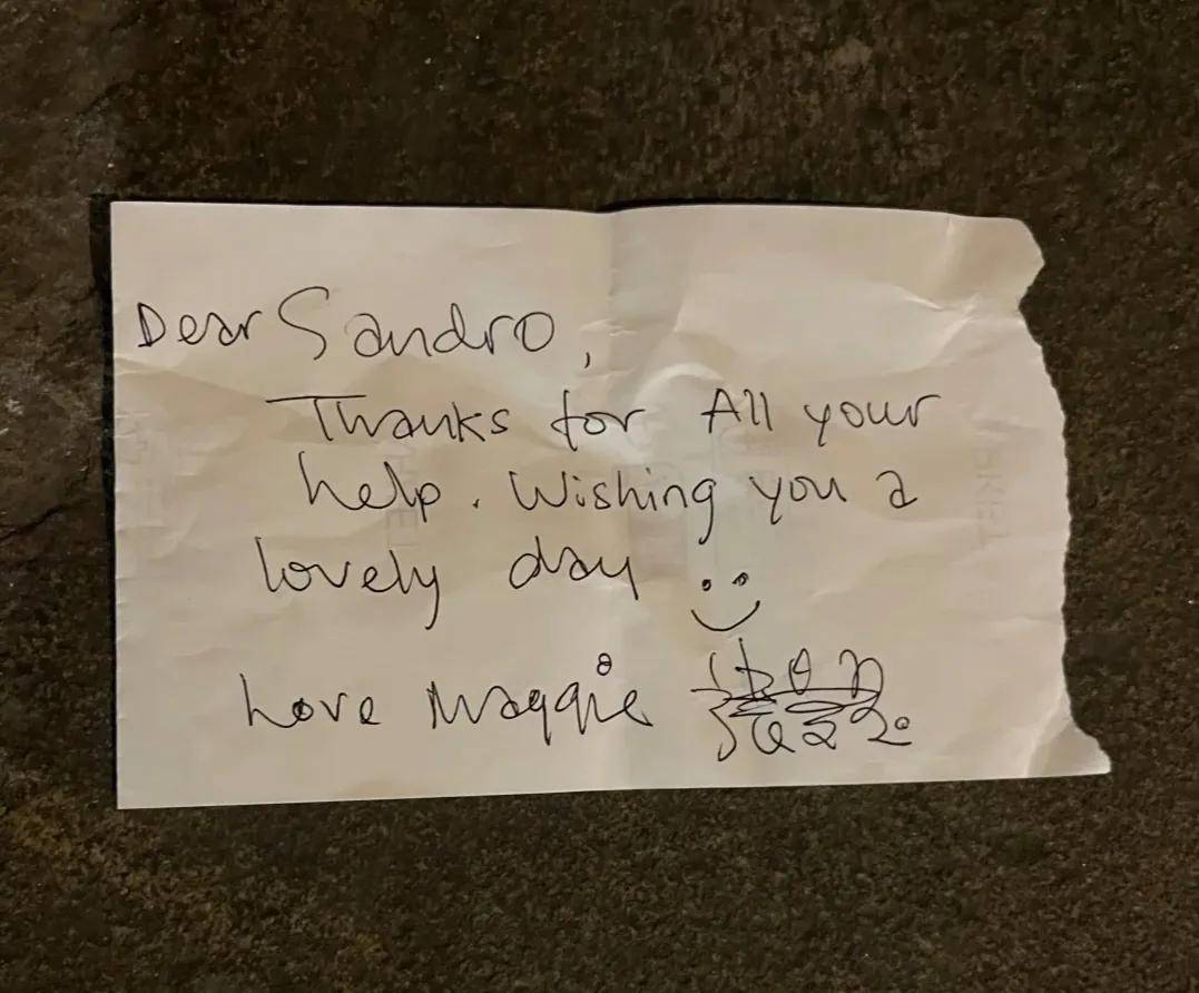 同时,博主分享了一张照片。照片上,是一张签名,上面用英文写了一段话:Thanksforallyourhelp,wishingyoualovelyday(谢谢你的帮助,希望你有个特别好的一天).