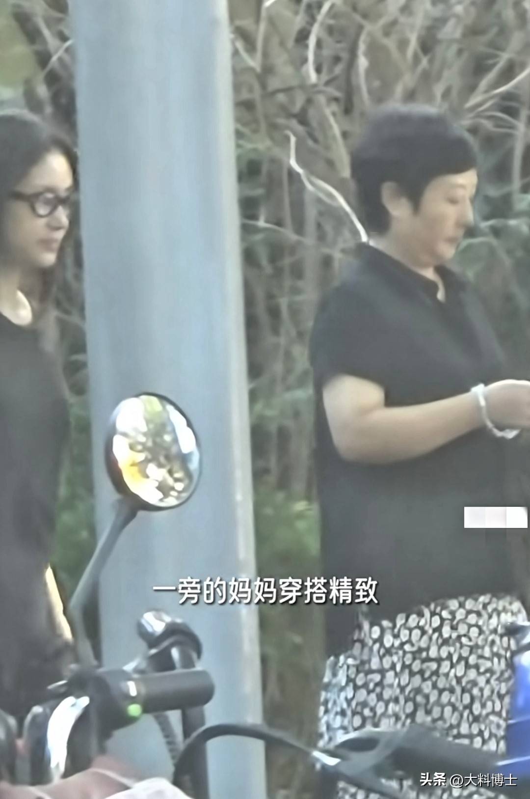 王子文一旁的短发年长女子是其母亲,相较于简装出行的王子文,妈妈打扮得颇为精致;头发梳得一丝不苟,脸上的皮肤干净白皙,眉毛显然是精心画过的,右手手腕戴着一串手链,黑色半袖衬衣搭配碎点长裙,整体看起来既贵气又有品位。