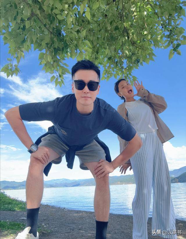 他穿着一身休闲的衣服和曾春蕾两个人开心的拍照,记录下此刻的幸福,旁边的风景甚是美丽。