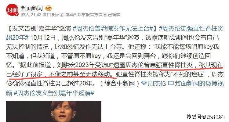 从刘畊宏的话中可以感觉到,这种病确实挺折磨人的。到周杰伦最严重的时候,曾经一段时间完全动不了,连平常走路都成问题,更别提站在台上唱歌了。