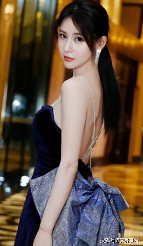 她身穿渐变蓝色的纱裙,领口设计挺大胆,差点碰到肚脐,背部大露背的设计,把她的好身材展现得一清二楚。