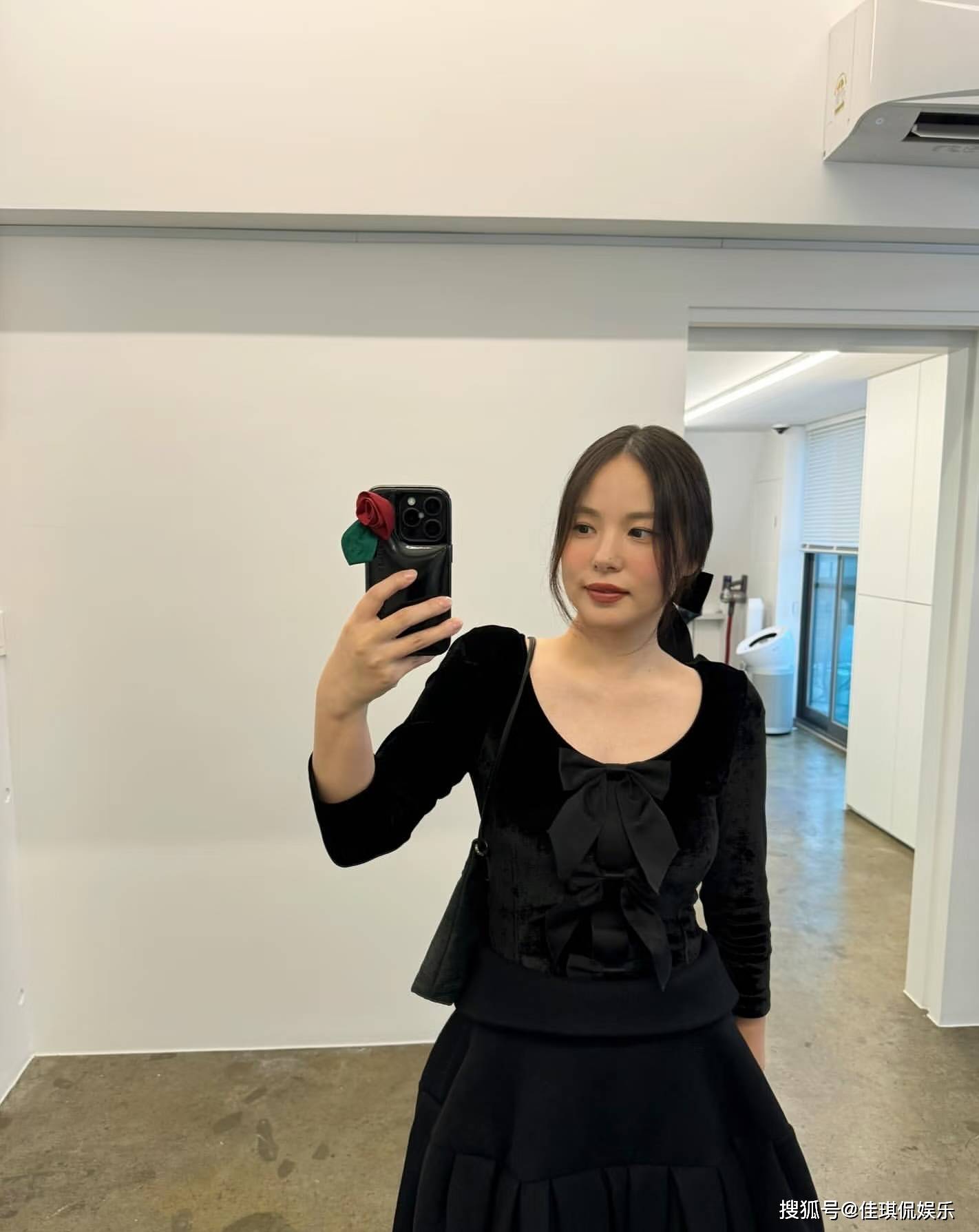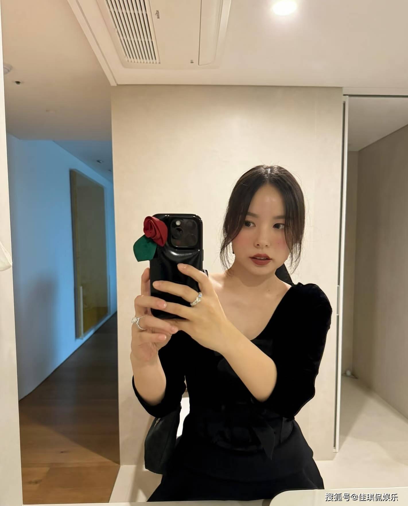 闵孝琳在参加婚礼当天拍的照片,她戴着戒指,拿着手机,手机壳是黑色的还有玫瑰花的设计,也挺好看的。