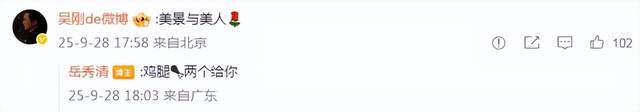 话说回来,除了网友晒出的偶遇照外,岳秀清也有在社交平台分享出巴黎度假时老公为她拍摄的美照,很快,吴刚就现身老婆评论区留言:“美景与美人”,岳秀清则回应“鸡腿,两个给你”。