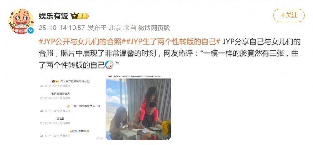 10月14日,有网友爆料,JYP娱乐社长朴振荣在Instagram上扔出一枚“温馨炸弹”——首次同时公开与两个女儿的合照,瞬间引爆全网。照片中,父女三人眉眼弯弯、