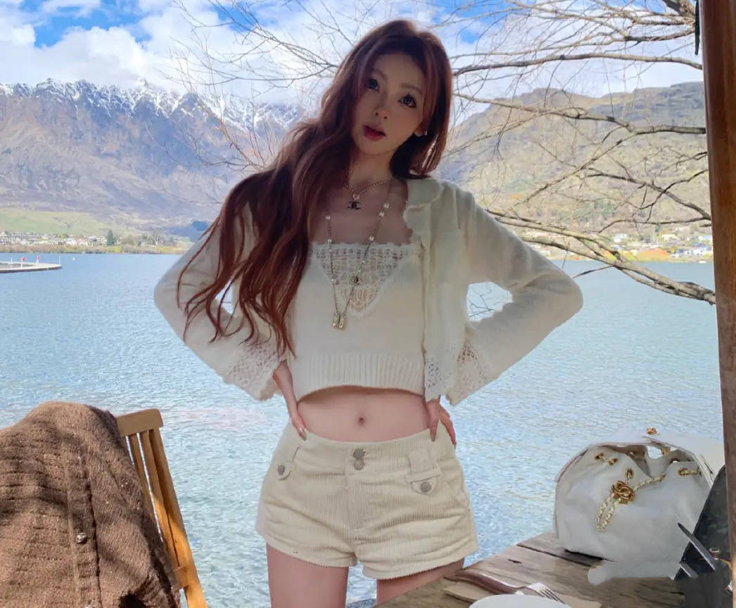 她全身都没有赘肉,不管是露肩膀、露肚脐、还是露大腿,都给人一种很自然的美。像这种露脐款的针织上衣,也给人一种很甜美可爱的感觉。