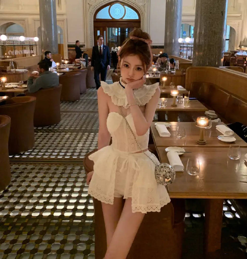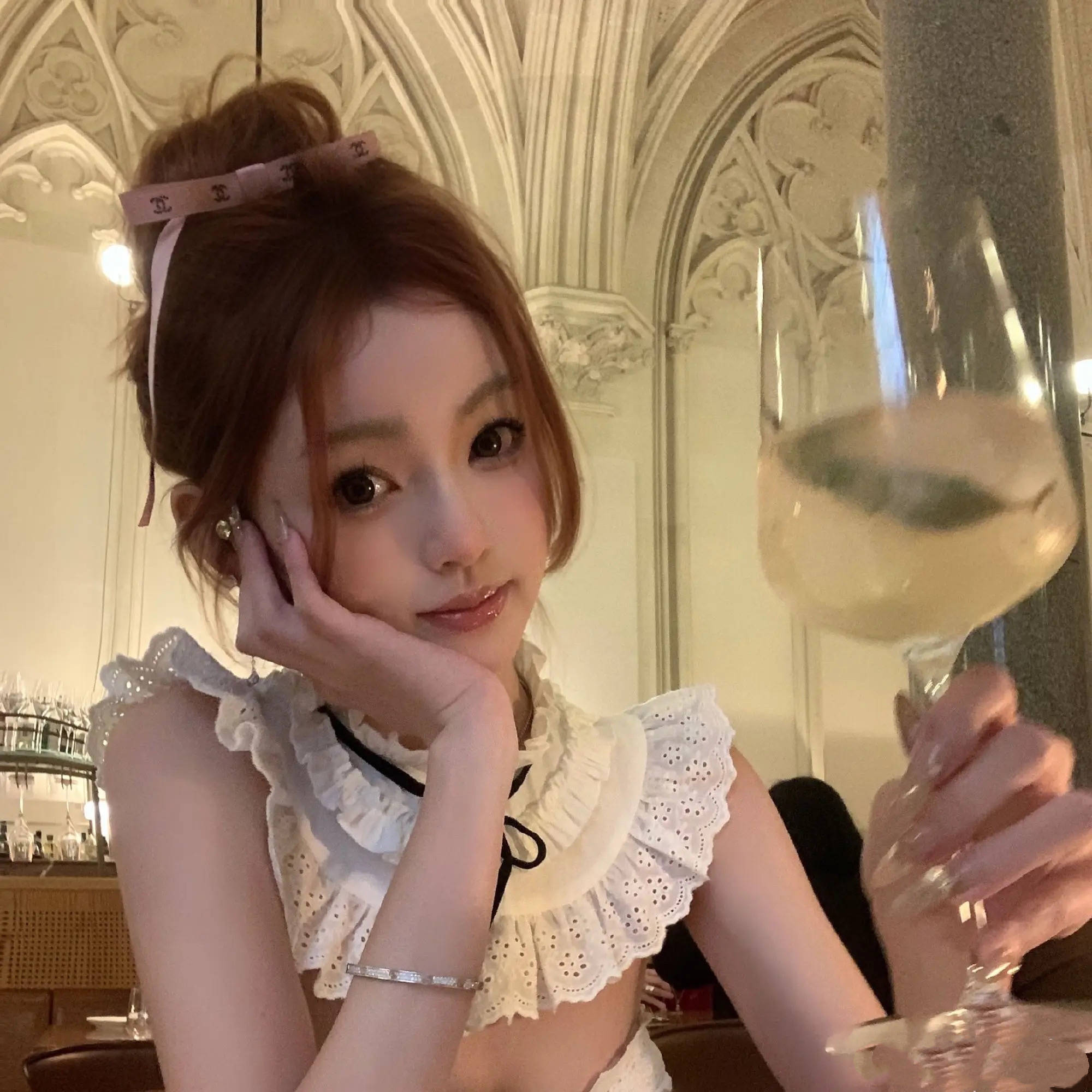 懒懒又瘦又美,穿这种衣服也很好看。白色的木耳边衣领+黑色丝带的修饰,有一种很精致很甜美的感觉。