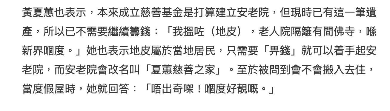 黄夏蕙称已经查清楚了自己该拿多少钱,所以她要在寿宴后立即去办理手续拿钱。黄夏蕙已经95岁了,这个年纪还去要那么多钱,自然不是为了享福。她公开表示曾经成立慈善基金是为了建造安老院,如果拿到这一笔遗产就不需要筹钱马上可以买地起楼。她已经找好了地皮,地皮旁边是佛寺,只要给了钱给当地居民,就能动工,她还已经给安老院取名了,就叫“夏蕙慈善之家”,届时自己也会搬进去生活,不得不说黄夏蕙真是一个心地善良的老人家。