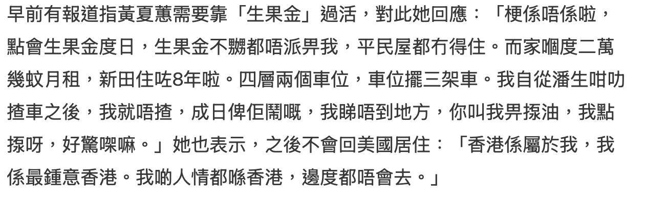 此次庆祝生95岁生日,黄夏蕙被问及相关的问题。她称生活并没有很困苦,目前既没有住政府的房子,也没有拿水果金过日子。她自曝如今住在出租的房子,每个月两万租金,都已经住了很多年了。出租房有四层楼高,还有两个车位,原本是与丈夫潘炳烈一起居住的,不过潘炳烈已经回美国生活了,也不会再回来了,当下就是自己生活。黄夏蕙称自己也不会再回美国生活,香港是她的家,最喜欢的就是香港,人脉什么的都在香港,所以哪里都不会去,就在香港养老送终。