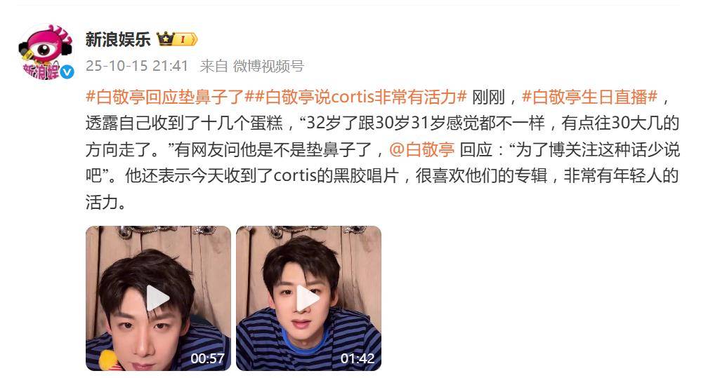 10月15日,白敬亭在生日直播中和网友互动,聊起了年龄感悟。他坦言“32岁了跟30岁31岁感觉都不一样,有点往30大几的方向走了”,语气中带着一份步入人生新阶段的清醒。直播氛围原本温馨轻松,他不仅透露收到了十几个生日蛋糕,还特别分享了自己收到了乐队cortis的黑胶唱片,直言很喜欢他们的专辑,觉得“非常有年轻人的活力”。