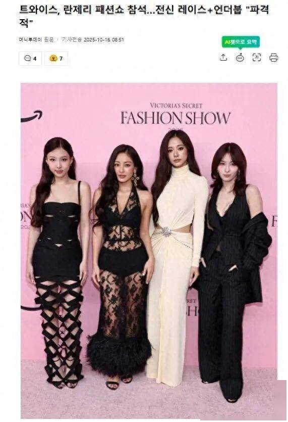 更值得注意的是,这不是韩流偶像第一次在维密“放大招”。从LISA去年引爆全网的梦幻舞台,到今年TWICE全员在粉毯上的多元演绎——深V、镂空、透视……几乎把性感风格“卷”出了新高度。网友一边感叹“韩娱造型越来越敢”,一边也调侃:“下次是不是该直接穿内衣走红毯了?”