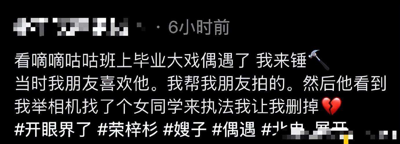 巧的是李禹熹的爆料有吃瓜群众补充证据,她称荣梓杉在去年12月21日陪同其中一个暧昧对象在北电看戏,有网友晒了现场同框照,还吐槽荣梓杉现场很警惕,看到有人拍找人执法删掉,脸色还臭到像要打人。