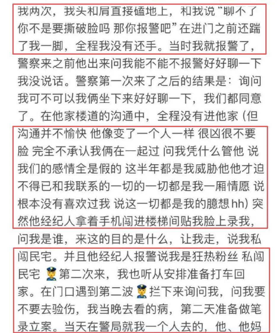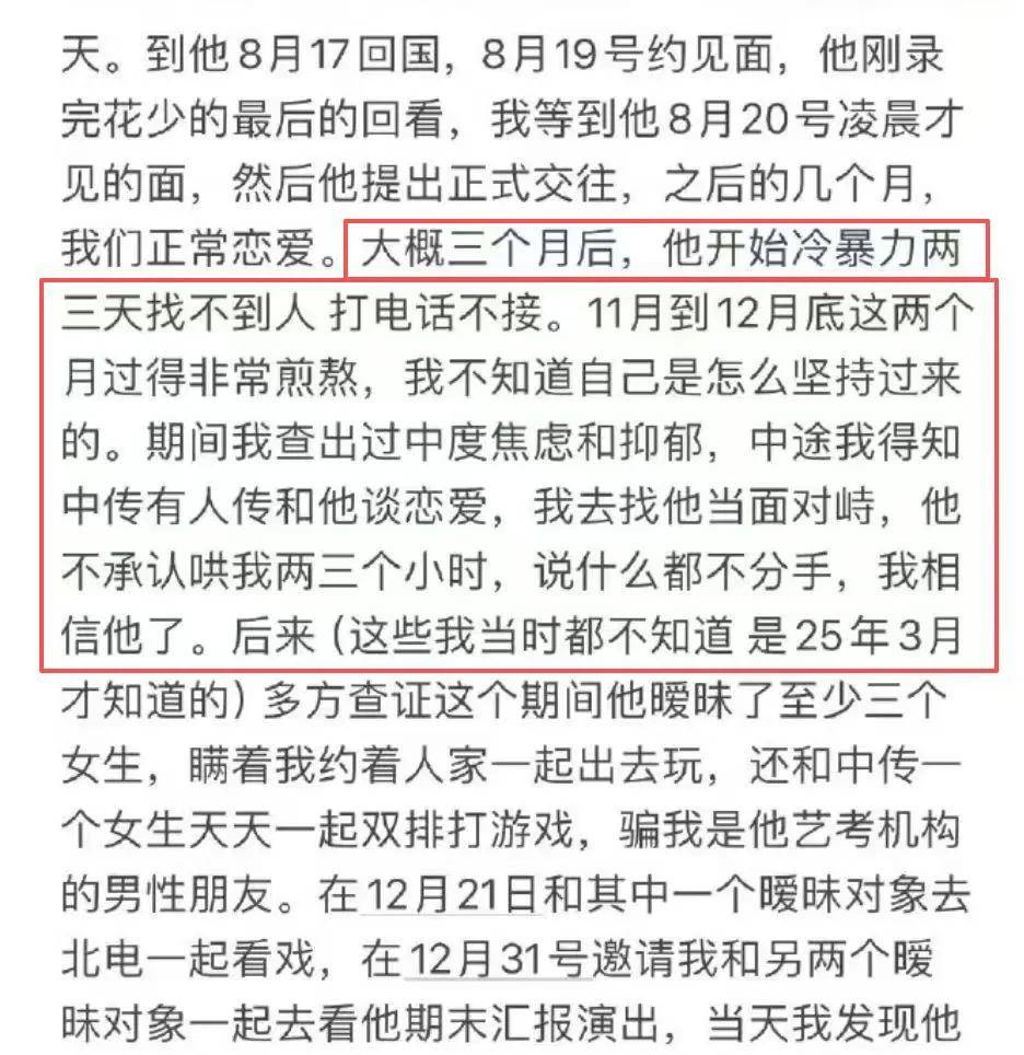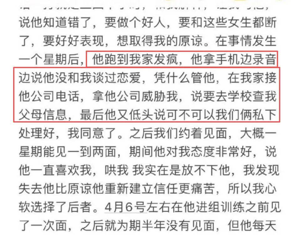 其三,荣梓杉承认出轨后一个星期又反悔了,冲到女方家发疯,自导自演录音“没谈恋爱”,拿经纪公司威胁女方及亲属,发现硬的不行后又调整策略,采用柔化策略哄骗女方原谅,女方看他低声下气认怂后决定和好。而这之后的半年里双方没见面,荣梓杉拿着生病、读书、进组等借口推托见面,一见面荣梓杉又承认出轨一个上戏女生,还试图拿童星挡枪,最终矛盾爆发。