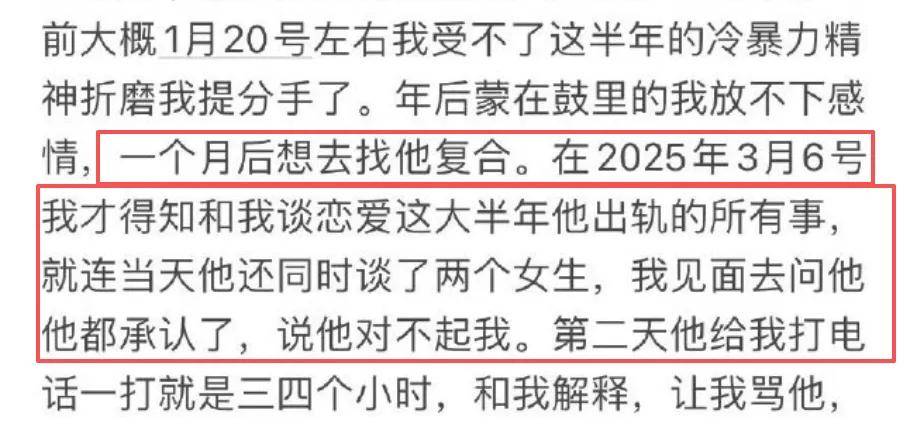 其二是女方调查核实查明男方出轨详情,发现男方与至少三个女生存有暧昧关系,不限于发现男方脖子上有草莓印等证据,查岗被糊弄,还被单方面删除联系方式,女方忍无可忍主动提分手。时隔一个月女方反悔又主动提复合,彻底明了荣梓杉劈腿实情,男方承认与她恋爱期间还谈了另外两个女朋友,并向女方道歉认错求和。
