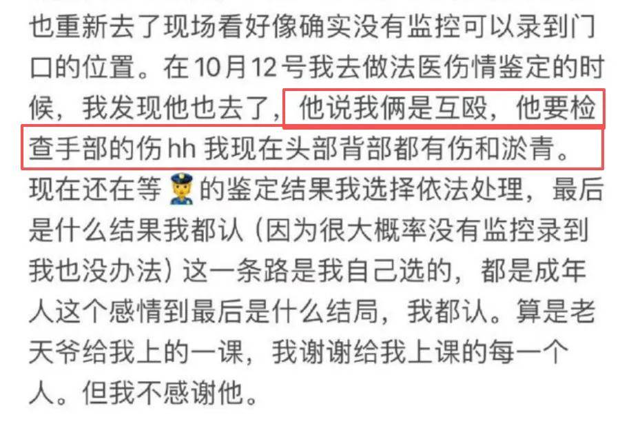 两人约见面沟通,结果就有了殴打女生的事,致女方头部、肩部受伤。荣梓杉见女方报警立案后又秒怂,卖惨求和无果后试图将女方控告的殴打模糊成互殴,搅浑水。
