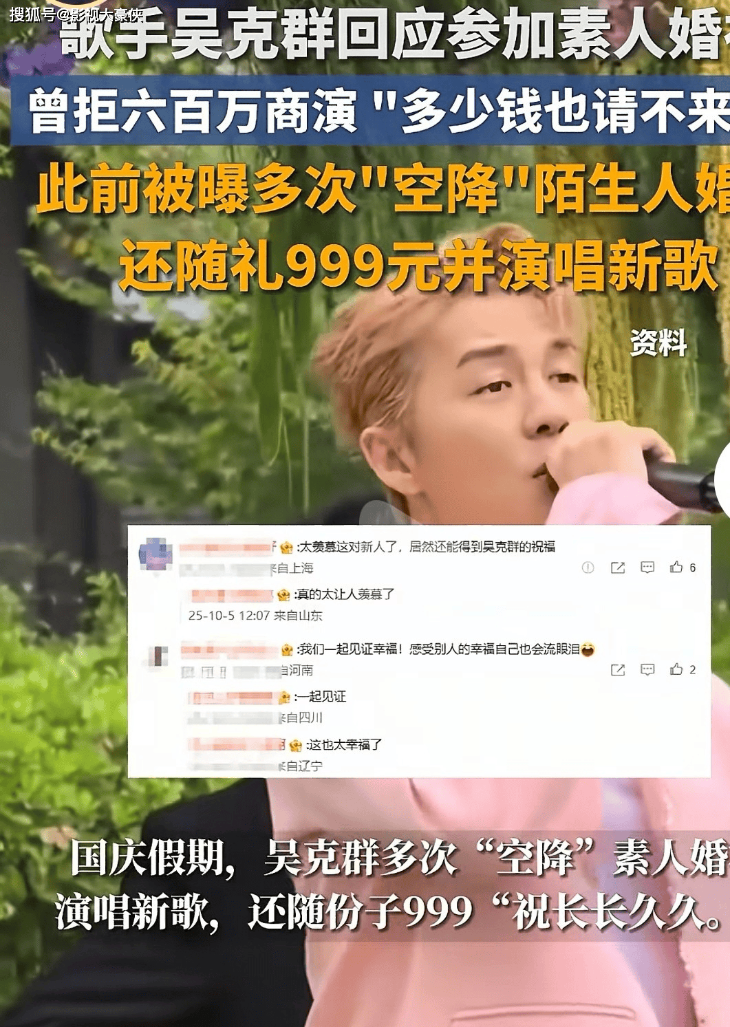 吴克群是在泸州参加音乐节时,偶然参加某素人的婚礼,他在婚礼现场为新人献上自己的成名曲,并且表示,有钱也请不到他参加婚礼,因为他觉得这是缘分,不是靠钱能替代的。