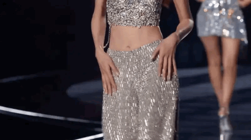 一套是白色亮闪闪的小背心+阔腿裤,非常的醒目高级,就连头上的装饰都做成了好看的雪花形状,一身亮片松弛闪耀。