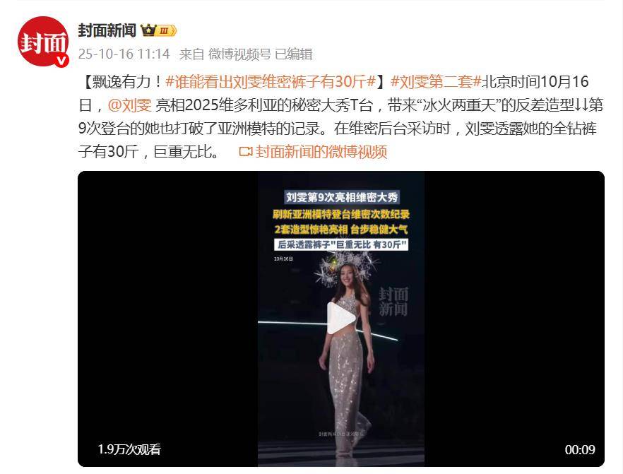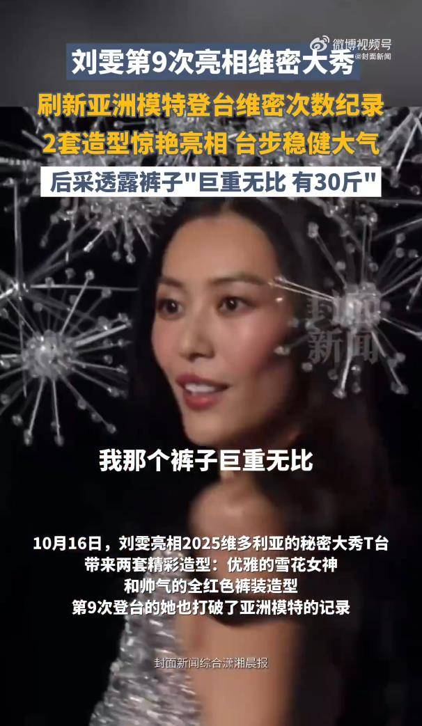 10月16日,刘雯第九次登上维多利亚的秘密大秀T台,一举刷新亚洲模特的走秀纪录。不过,这次最引人瞩目的不是她的台步,而是那条“重到让人怀疑人生”的全钻裤子——整整30斤,几乎相当于她体重的三分之一!